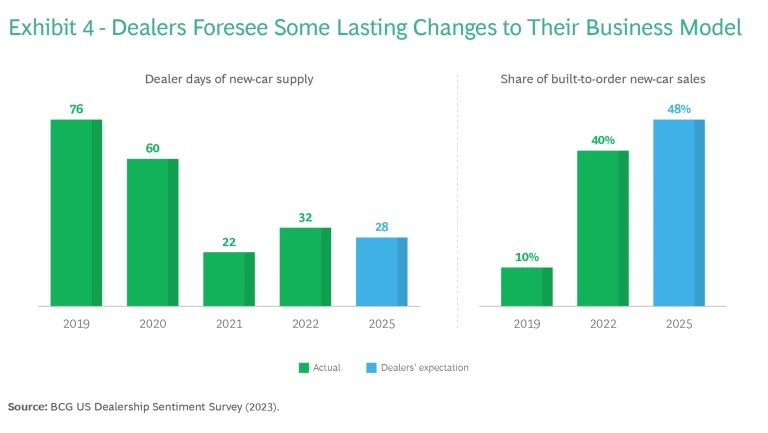 We asked dealers what they expect going forward: Will these trends have a lasting impact, or will the metrics revert to 2019 levels? There was strong consensus that the shifts will stick. Dealers expect a roughly 30-day supply as the new normal and a BTO share of about half of vehicles sold. (See Exhibit 4.)