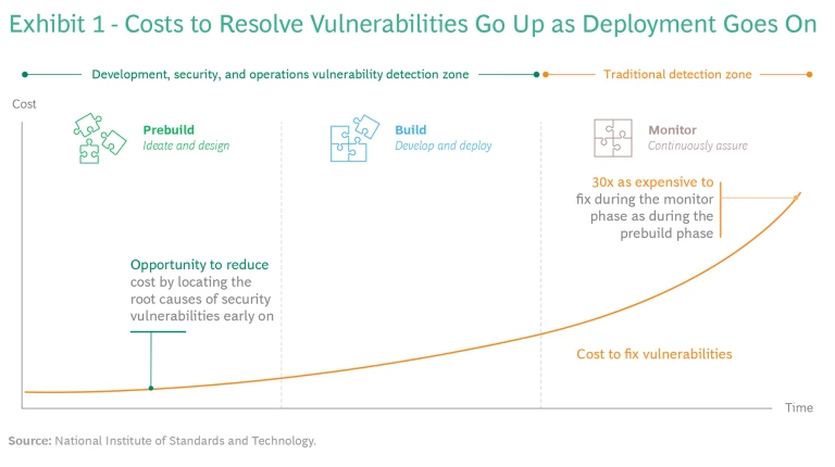 By forming and refining security plans earlier in the cloud development life cycle, organizations can identify vulnerabilities promptly and lower the costs of addressing them. Such costs grow exponentially as the life cycle progresses, meaning that the longer an organization waits to put adequate security controls in place, the more expensive the effort will be. According to the National Institute of Standards and Technology, vulnerabilities introduced in ideation and design are roughly 30 times as costly to resolve after deployment as when detected and fixed early on. (See Exhibit 1.)