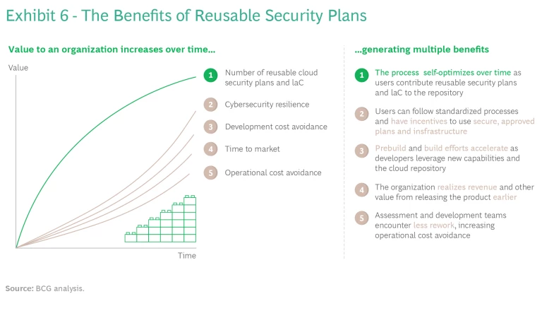 At the conclusion of the prebuild process, teams will have access to a reusable security plan that increases efficiencies and value to the business. As the number of preapproved security plans grows, the number of accelerated paths to the build phase will increase, crystallizing the value proposition of self-optimization. (See Exhibit 6.)