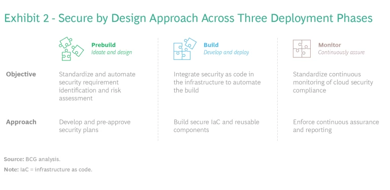 The Secure by Design approach aims to establish automated security processes that extend within and across each phase of the cloud development life cycle. By developing and codifying security controls during the prebuild phase, the business puts itself in a position to form comprehensive security plans. These plans promote efficiency throughout the development cycle, from ideation to continuous assurance. (See Exhibit 2.)