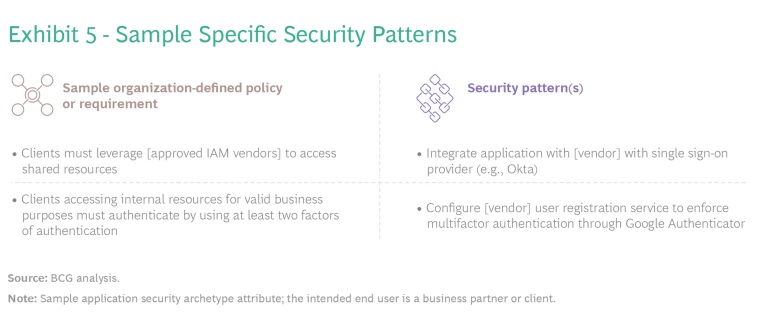 Draft security patterns. Security teams must draft security patterns matched to in-scope controls and requirements. Security patterns enhance security requirements by framing them as actionable descriptions that make sense to developers. Patterns must be specific enough to support automation in the build phase, such as through IaC. (See Exhibit 5.)
