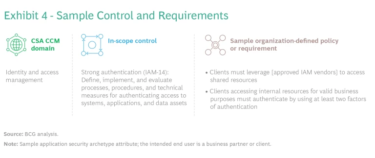 Identify in-scope controls, and define security requirements. After defining an archetype, security teams can identify security controls that are suitable for the group of applications. Teams should ensure that any requirements needed to satisfy the control comply with all relevant laws, regulations, and frameworks. In many cases, multiple requirements are necessary to collectively satisfy a given control. (See Exhibit 4.)