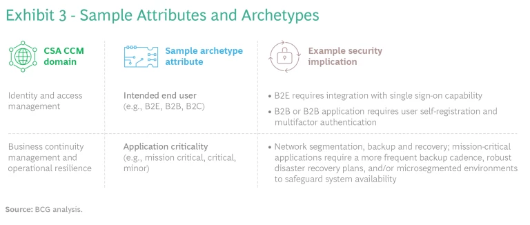 Define application security archetypes. The organization should group applications into archetypes. Teams can identify attributes or specifications that have security requirements in common, given their risk profile and business context. (See Exhibit 3.) When grouping applications into archetypes, teams should strive for alignment with a common framework, such as the Cloud Controls Matrix (CCM) created by Cloud Security Alliance (CSA). Financial institutions (FIs) can use the Cyber Risk Institute’s Cloud Profile, which harmonizes FI-specific security regulations and standards and was developed in alignment with CSA’s recently released CCM 4.0.