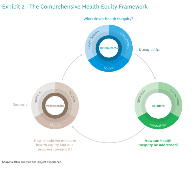 Health equity concerns are highly dependent on the population, geography, and disease area in focus. The Comprehensive Health Equity Framework is a stakeholder-agnostic tool that can be applied to any health equity problem within an organization and at various scales (global, national, local). Working through and identifying the various components will give companies a comprehensive understanding of three interconnected health equity systems: determinants, solutions, and measurements. (See Exhibit 2.)