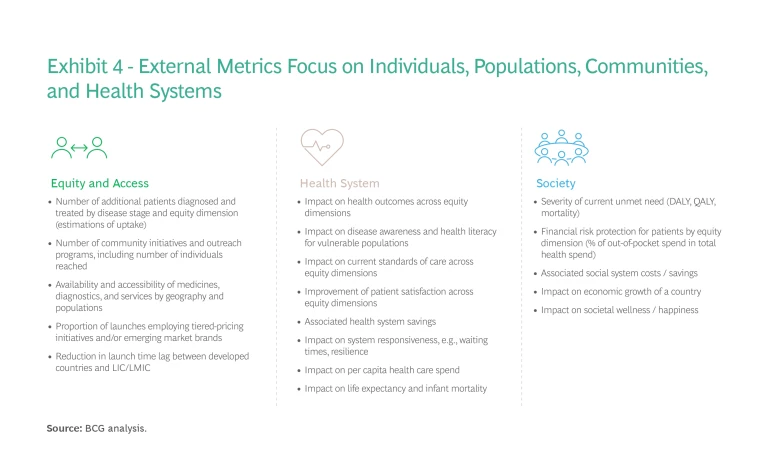 Internal metrics can measure resources (people and budgets) and return on investments, milestone achievement against plan, and aspects of collaboration and innovation across the organization. External metrics describe equity and access across individuals and specific populations. They also track health system and social/community data and impacts. (See Exhibit 4.)