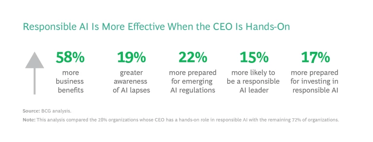 Slightly more than one-quarter of CEOs—28%—play a hands-on role in responsible AI programs through hiring, target setting, or product-level discussions. These companies report 58% more business benefits from their responsible AI activities than other companies.