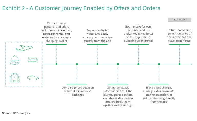 Offers and Orders will allow airlines to implement use cases to improve the customer experience (see Exhibit 2) that are very difficult to implement with current technology (particularly in indirect channels). A few examples include: