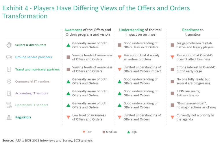 As part of our research, we gauged the awareness, understanding, and readiness of the airline ecosystem for the transition to retailing (see Exhibit 4). We also investigated the business case for airline partners in terms of their own expected benefits and costs, and we evaluated which adoption mechanisms might help accelerate the transition.