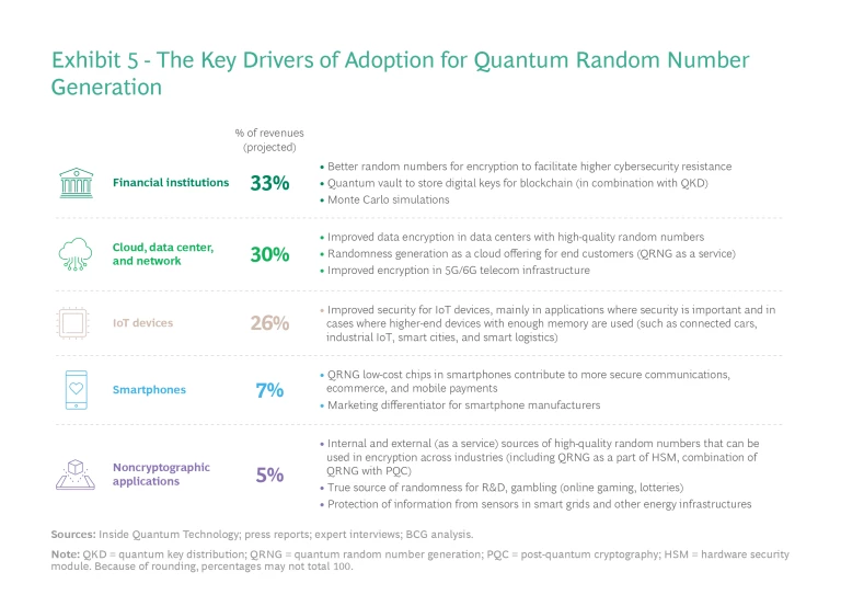 Industry experts expect QNRG to be deployed at scale as coprocessors or within system-on-chips. Adoption of QRNG will grow across many verticals, including finance and the Internet of Things (IoT), as organizations are drawn by these evolving use cases and the need to manage heightened security risks. (See Exhibit 5.)