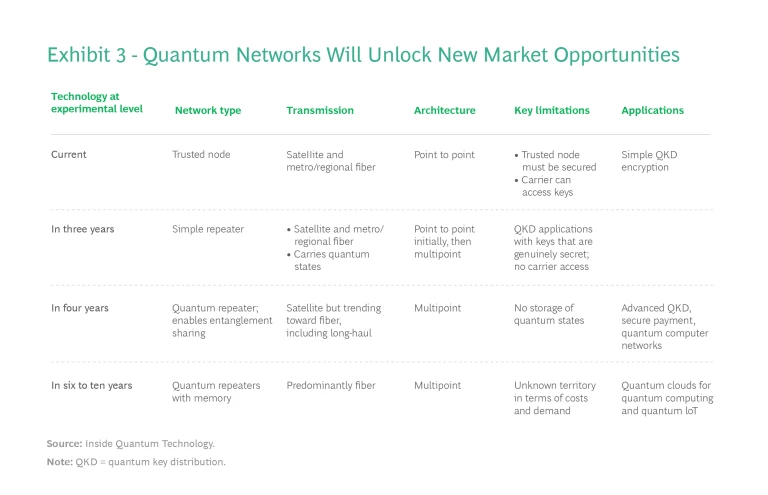 Innovations such as quantum repeaters and quantum memory are expected to gradually reduce the current limitations in distance and bandwidth. (See Exhibit 3.) Overall, these deployments and innovations will unlock a broader market opportunity that will grow in scale and activity over the next ten years.
