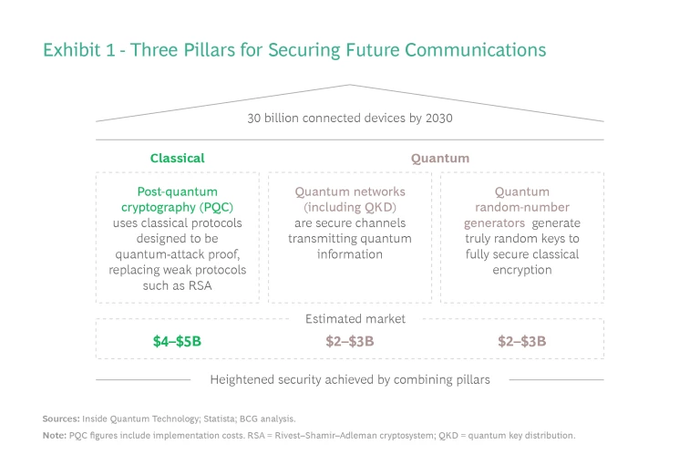While some observers advocate for one method over the other, the highest level of network security relies on a combination of classical and quantum approaches. (See Exhibit 1.)