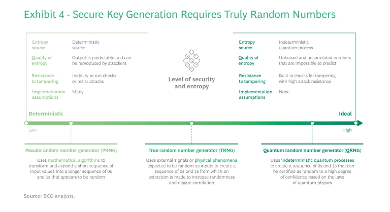 QRNG technology eliminates that flaw by leveraging quantum properties to generate truly random numbers. Regardless of the numbers generated by the system in the past, it is impossible for any actor to accurately predict the next one. (See Exhibit 4.)