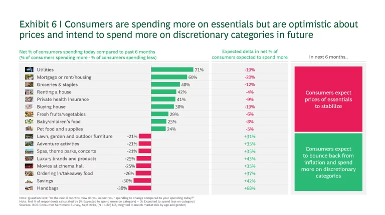 Although the rising price of essentials is the primary driver of increased spending, consumers are optimistic about spending on select discretionary spend categories in the near future. They expect that the impact of inflation will recede to stabilise prices on essentials, allowing them to spend more on non-essentials. See Exhibit 6.