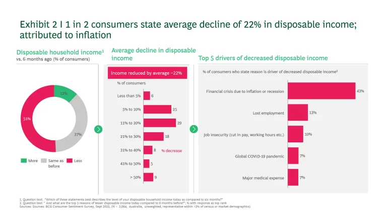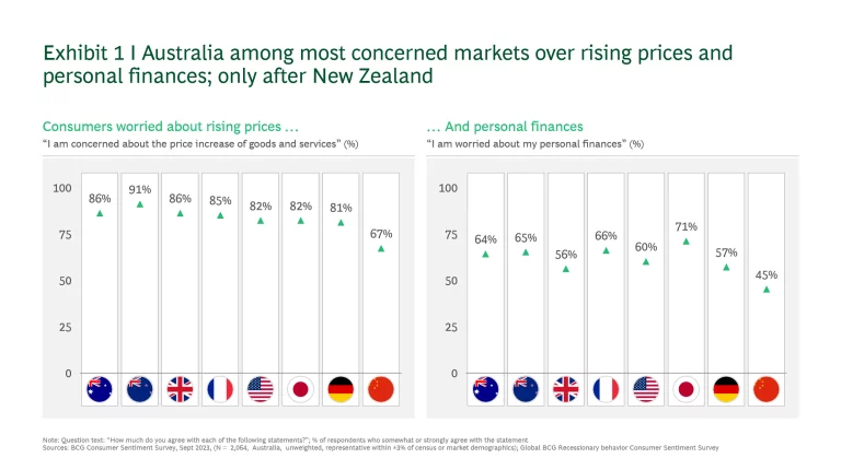 The Australian Consumer Sentiment Snapshot series shares insights from a BCG consumer survey undertaken with our coding and sampling partner, Dynata. The survey aims to uncover how consumer perceptions, attitudes and spending behaviours are impacted by the inflationary environment. This snapshot presents insights from Round 7 of the survey, gathered in September 2023. We have drawn comparisons with research completed in previous rounds and other countries.
