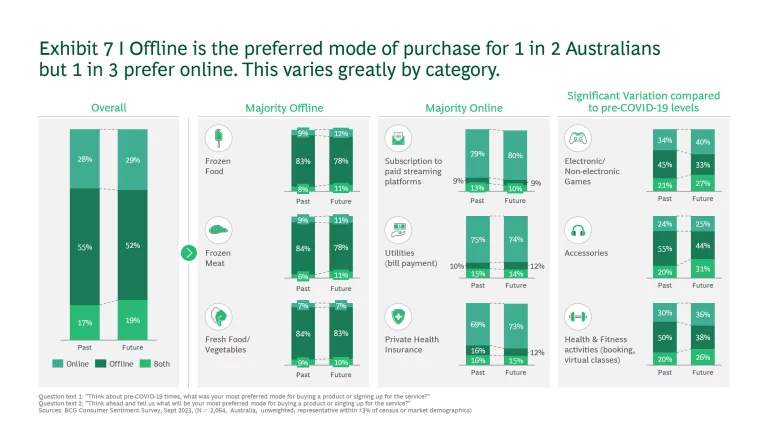 We asked consumers to choose their preferred mode of purchasing by category. For 1 in 2 consumers, in-store purchases dominate but 1 in 3 consumers prefer online. These preferences vary greatly by categories. See Exhibit 7 to see how today’s preferences compare to pre-COVID.