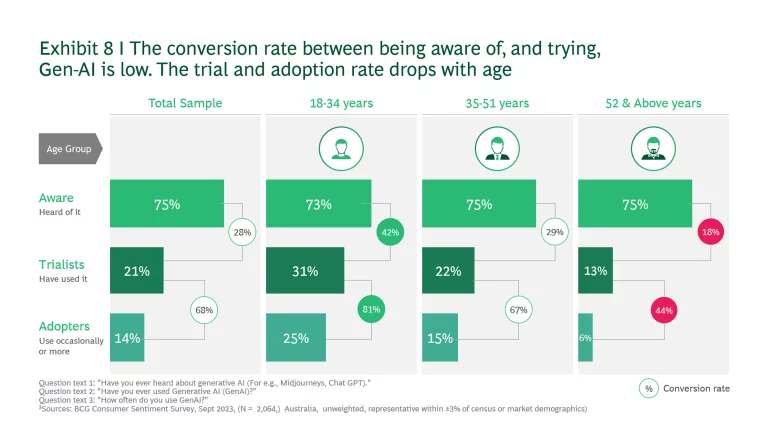 We did a pulse check on Gen-AI. Despite 75% of consumers being aware of Gen-AI tools, only 14% adopt it for personal or professional usage and the adoption rate is even lower among the silver generation. However, once consumers try it, Gen-AI soon becomes a go-to tool for 68% of consumers. See Exhibit 8.
