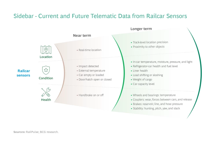 The revolution begins with tracking technology. The technology required to implement telematics tracking devices for railcars is either available today or being tested in advanced pilot programs. These devices will soon be widely deployed to transmit critical data on railcar location, condition, and health to shippers, railroad operators, and railcar owners. (See the sidebar “Railcar Sensors Are Already Available, and Many More Are Coming.”)