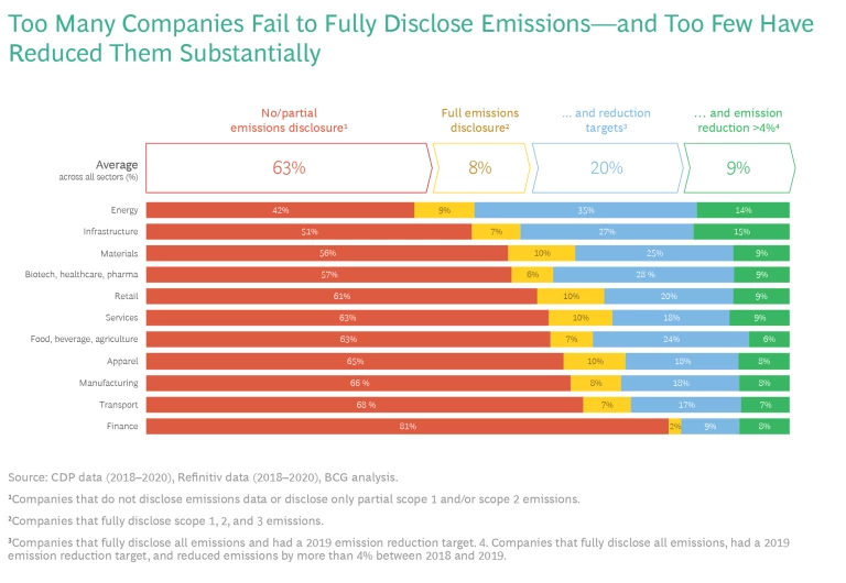 Few companies have succeeded in making real progress, however. According to CDP, a not-for-profit that tracks global emissions, more than 3,600 companies have announced net zero commitments to date, more than half of them based on science-based targets. Nevertheless, this accounts for just a third of the global economy by market capitalization—and less than 10% of companies have reduced their emissions by more than 4%. In fact, to date, more than 60% of companies across all sectors disclose only partial information on scope 1 and 2 emissions or provide no emissions data at all. (See Exhibit.)