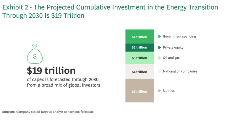 The analysis by BCG’s Center for Energy Impact of global energy sector investment needed through 2030 to reach emissions reduction goals yielded the following key findings: