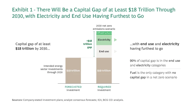 - Capital Challenge. An $18 trillion capital gap exists between current commitments and the investments needed for alignment with net zero goals in 2030. Electricity and end-use sectors account for 90% of that shortfall.