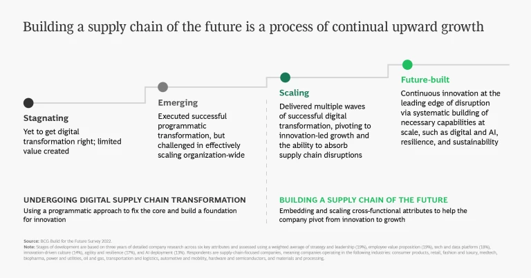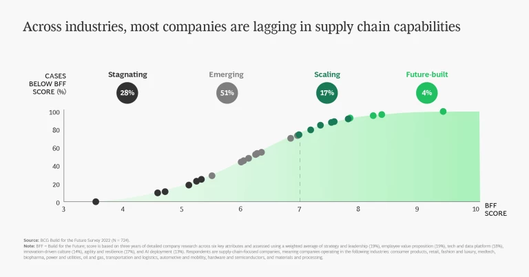 Building a future-ready supply chain is a complex, multilevel process. As the exhibit shows, relatively few of the companies we analyzed have made substantial progress on that journey.