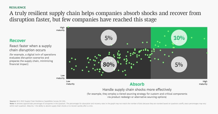 Successful supply chains will be able to withstand a variety of disruptions, such as fluctuating demand, high interest rates, trade actions, natural disasters, and labor shortages. They will weather micro trends around make-versus-buy decisions, internal risk assessments, internal digital maturity, and vendor partnerships. And they will spur innovation, inspire new business models, and provide significant competitive advantage. Here’s what our research shows.