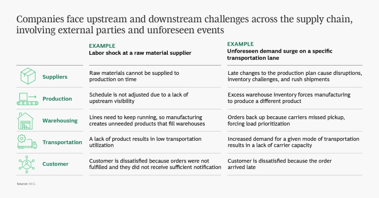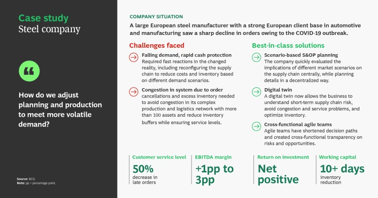 Managing a Complex Production Network. A large industrial goods business faced siloed operations between teams that were located in different places and had different priorities. The result: excess inventory, service challenges, and production losses across the network. The company resolved the issue by creating “digital twins” that provide a detailed digital representation of all aspects of the supply chain along with a simulation of full system flows (up to 12 weeks in advance) and a menu of mitigation actions.
