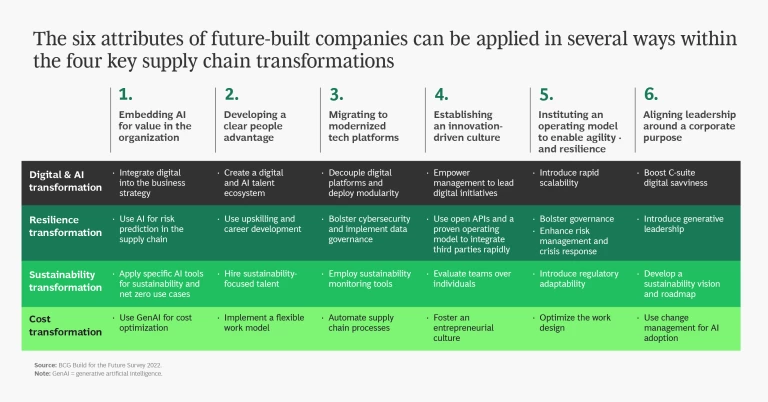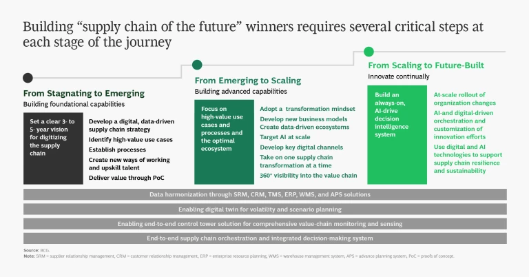 Innovate continually. As companies progress from scaling their digital transformation to creating a truly future-built supply chain, we recommend building a decision intelligence system. Such a system would use AI and ML to absorb data and patterns. provide recommendations, and support rapid decision making—thereby helping to ensure a resilient and sustainable supply chain.