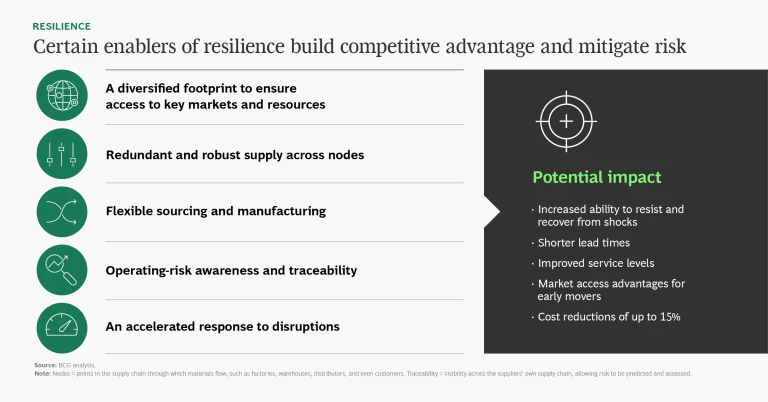 - The resilient supply chain requires a comprehensive program to better handle shocks. Such a program comprises network and product design, sourcing strategy, and planning. And it must be able—through monitoring, prediction, and crisis response—to move quickly when disruption occurs.