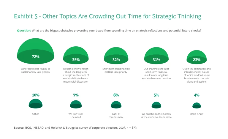 When asked what was blocking them from spending meaningful time on strategic thinking about sustainability, more than 72% of directors cite the need to devote time to non-sustainability related, high-priority topics. Other obstacles include the lack of knowledge about long-term implications of sustainability and the need for short-term sustainability matters to take priority. (See Exhibit 5.)