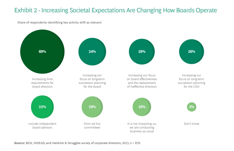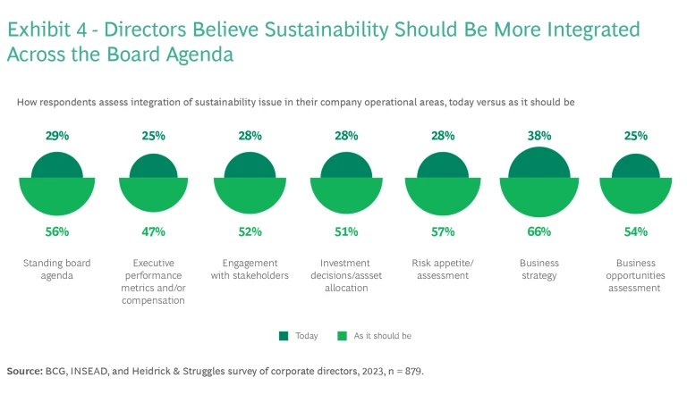BCG, INSEAD, and Heidrick & Struggles have teamed up to find out. We cast a wide net with a global survey reaching 879 respondents in 19 industries and a series of roundtables involving more than 200 directors. We found that boards are adapting, making changes to how they approach their own composition, their governance and process considerations, and the metrics they track. But they also continue to wrestle with challenges, most notably how to integrate sustainability fully into company strategy. Although the majority of respondents say that sustainability considerations should be fully integrated into business strategy, only a minority report that is the case today.