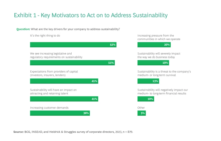 There are, however, other factors driving board action. Just over half of the directors in our survey cite increasing legislative and regulatory requirements as a key driver of company efforts to address sustainability with a similar share saying they are acting because it’s the right thing to do. (See Exhibit 1.)