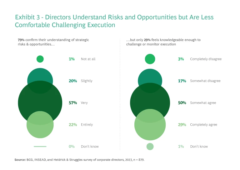 A strong majority (79%) say their board has a very or entirely clear understanding of the strategic opportunities and risks sustainability presents—but only 29% completely agree they have sufficient knowledge to effectively challenge management on sustainability plans and ambitions and exercise oversight on their execution. (See Exhibit 3.)