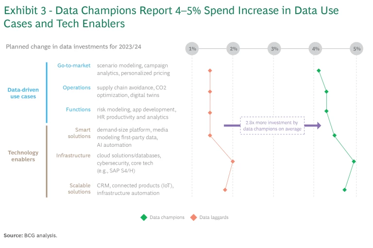 Champions invest in scalable, data-driven use cases with a strict eye on value and business outcomes—knowing when to pull the plug on pilots that are not living up to expectations and when to double-down on those that drive real value. They balance the need for positive short-term ROI with longer-term bets on more innovative initiatives. On average, they plan to invest about 2.8x more than laggards in data-driven use cases across the value chain and technology enablers. (See Exhibit 3.) Also, 76% of champions report having a strategy in place for generating value from data, and they measure value realization regularly. Only 46% of laggards report the same.