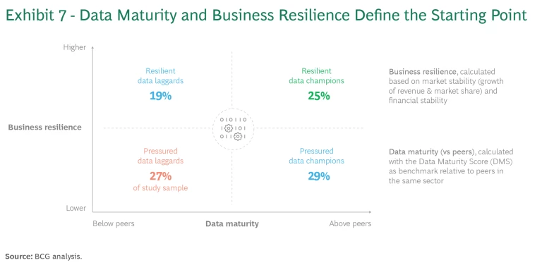 Being a data champion does not mean a company has completely mastered data. Even champions continue to face many challenges on the road to data maturity. All companies should ask: What is our starting point, and how can we accelerate the path toward high data capabilities? The answer to these questions depends on the company’s status in terms of two dimensions: data maturity and business resilience.