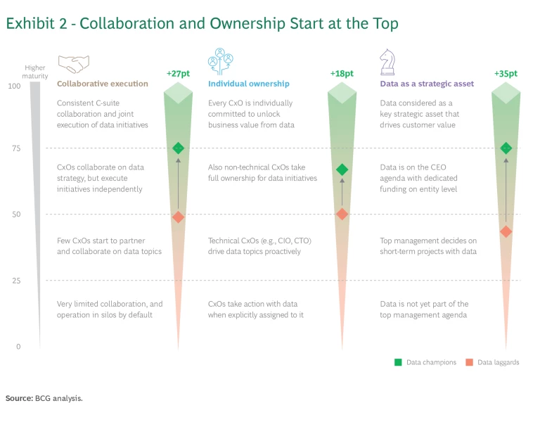 In our current study, data champions scored 27 points higher than laggards in C-suite collaboration. Members of the C-suite take ownership of their functional and business domains for data-related business outcomes. They put processes and incentives in place that empower people, and they ensure that messaging is consistent from the top of the organization down to frontline employees.