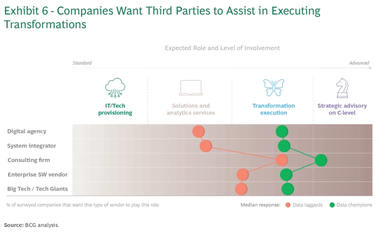 We have studied what companies expect from their partners, such as digital agencies, system integrators, Tier 1 consulting (management and strategy), enterprise software vendors, and tech giants. It’s clear that the role of partners is changing. (See Exhibit 6.) Data champions expect third parties to be much more than providers of IT, analytics, and other technology products and services. They want full transformation partners that can help them discover disruptive solutions and scale data offerings, and they lean heavily into the cloud to achieve these goals. In fact, spending on cloud solutions, including highly responsive databases, is expected to increase the most of any data-enabling technology in 2023 and 2024 (followed by AI, security solutions, and data analytics).