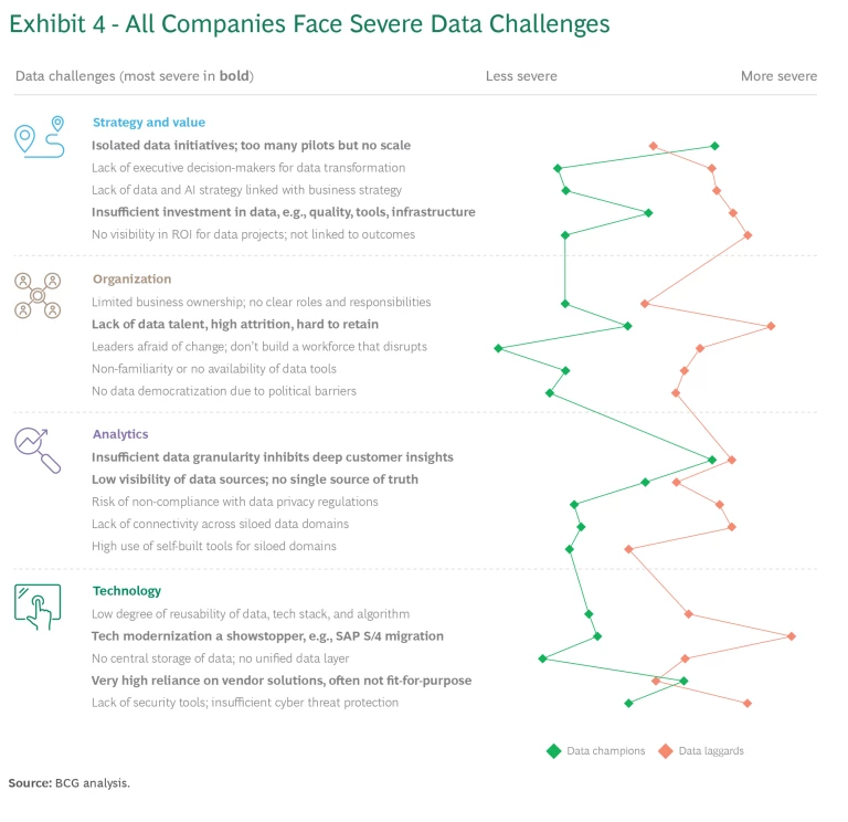 It’s hard to overstate the importance of starting with clean, high-quality data. Yet every company in our study reported struggling with data challenges that span the entire data journey—from sourcing, cleaning, validating, and accessing data to sharing it internally and externally. For a vast majority (70%), the challenges are so severe they pose a threat to the success of their use cases. Unsurprisingly, data champions face significantly fewer challenges than laggards, and their struggles tend to be less severe. (See Exhibit 4.)