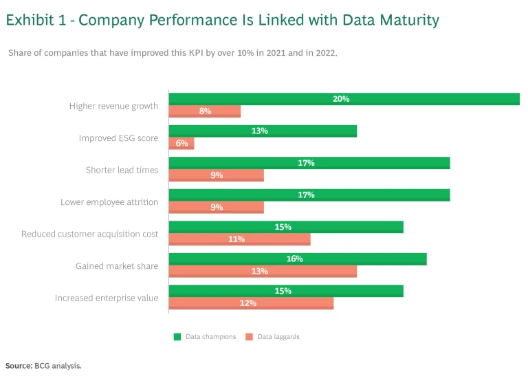While the road to data maturity is not an easy one, it’s necessary and well worth the effort. We found that data maturity, performance, and resilience are strongly linked. (See Exhibit 1.) Across major indicators such as revenue growth, sustainability (ESG score), lead times, or employee attrition, data champions have outperformed their laggard peers. For example, champions grow their revenue over twice as fast as laggards.