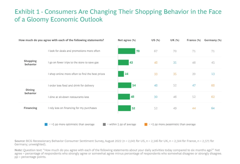 In response, consumers are changing their buying behavior. They are spending more in nondiscretionary categories such as gas, fuel, and utilities, and either spending less or trading down in the discretionary categories such as alcohol, fashion, and cosmetics. (See Exhibit 1.) They are looking for promotions, shopping online to get better prices, making fewer trips to the store, and reducing their leisure expenditures. A decline in real wages in 2022 is reinforcing consumers’ negative sentiments, with the US and the UK reporting real wage declines of 3% and the European Commission forecasting similar declines for the euro area.