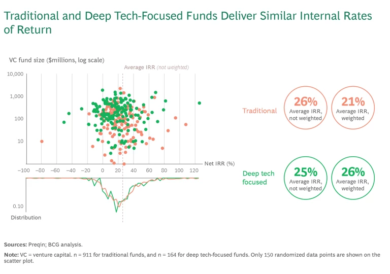 Here are two facts that may surprise many investors. The first is that deep (or emerging) technologies have become a mainstream destination for corporate, venture capital, sovereign wealth, and private equity funds. Deep tech claims a stable 20% share of venture capital funding, up from about 10% a decade ago. Second, deep tech returns are similar to those of other venture investments. (See the exhibit.) Our analysis of about 1,100 venture funds shows that over the past five years, the weighted average internal rate of return was 21% for traditional venture capital investors and 26% for deep tech-focused funds. (The nonweighted returns were 26% and 25%, respectively.)