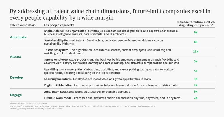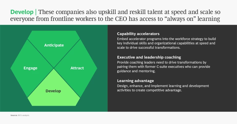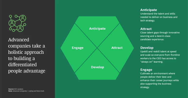 These forward-looking enterprises develop a people advantage by focusing on four aspects of the talent value chain. They: