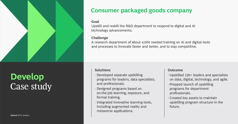 - Develop—Upskill and reskill talent in the flow of work, at speed and scale so everyone from frontline workers to the CEO has access to “always on” learning and the impact is rigorously measured.