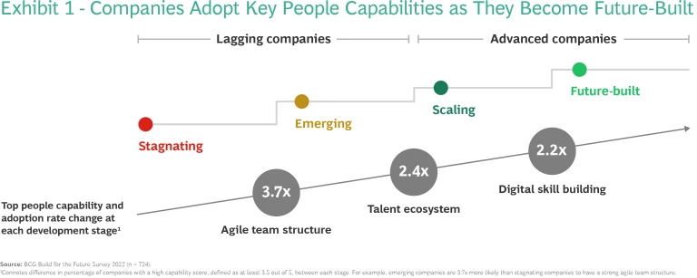 Organizations’ people capabilities improve as they adopt more elements of the holistic approach we’ve outlined and progress from lagging, those organizations that are stagnating or emerging, to advanced, those that are scaling or future-built. (See Exhibit 1.) As organizations advance toward being future-built, they first must adopt agile ways of working, with teams that can adjust quickly to changing demands. Then they must optimize their talent ecosystem to attract job candidates from multiple internal and external sources. Finally, they must focus on digital skill building, providing people with opportunities to cultivate AI and advanced analytics skills.
