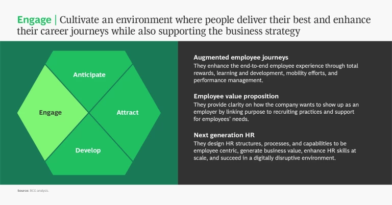 - Engage—Cultivate an environment where people deliver their best and enhance their career journeys while also supporting the business strategy.