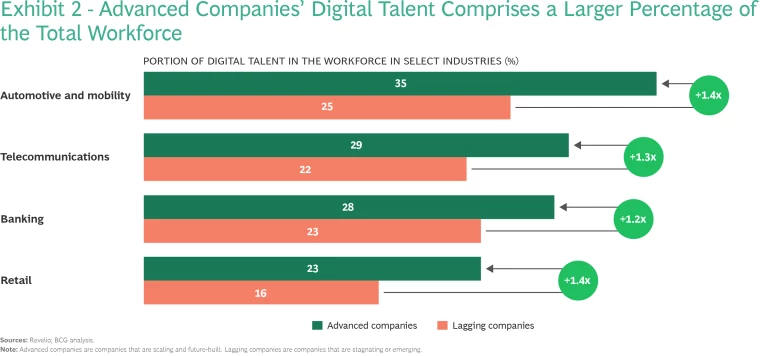 Advanced organizations identify critical digital talent and skills and understand the need to have the right people to steer digital and sustainability initiatives. It’s no surprise that across multiple industries, these organizations have a larger share of digital talent in their total workforce. (See Exhibit 2.) They also prioritize recruiting digital talent, with a third (29%) of these companies’ job postings requiring digital skills compared with 18% for stagnating and emerging companies.