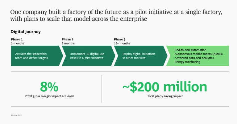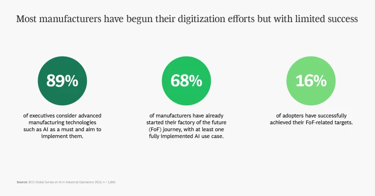 Most manufacturing companies have launched digital initiatives in their facilities, but these are often isolated initiatives that are not sufficiently comprehensive. Consider that in a recent BCG survey of 1,800 executives, 89% regard advanced manufacturing technologies like AI as crucial, but only 68% have implemented at least one AI use case, with a mere 16% successfully achieving their targets.