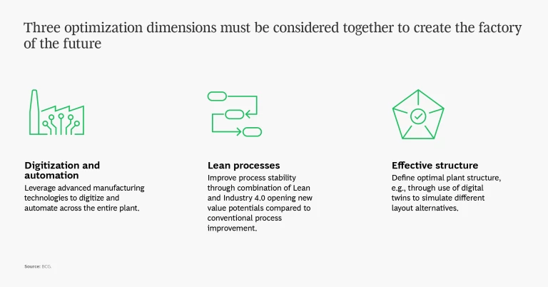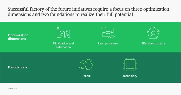 Building the factory of the future is a significant task that involves focusing on three optimization dimensions—along with two foundational dimensions—to continuously improve the factory.