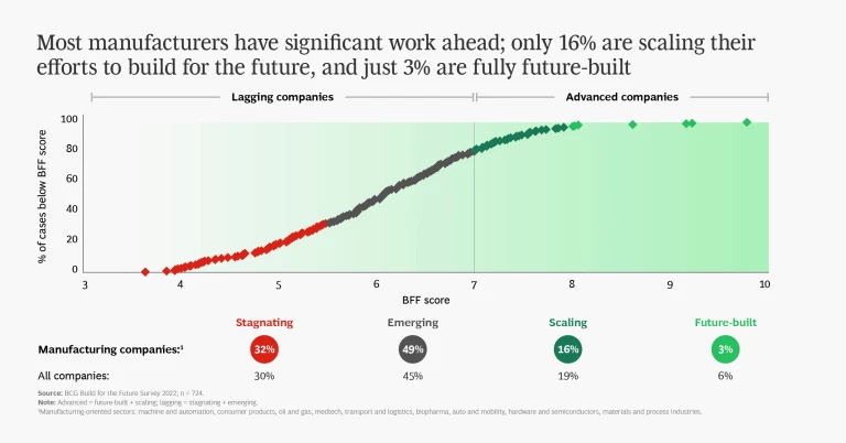 - Most manufacturers have significant work ahead. Only 16% are scaling their efforts to build for the future, and just 3% are fully future-built.