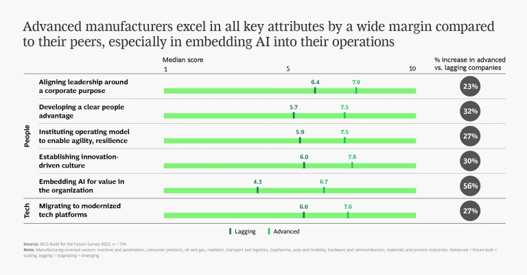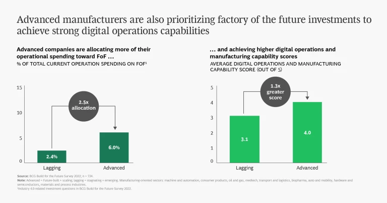 What sets top performers apart? In our analysis, advanced manufacturers lead their peers across all six key attributes by a significant margin, particularly in embedding AI into their operations, where they excel by 50%. They also allocate resources to projects that will pay off. Specifically, advanced companies allocate 2.5 times more of their operational spending toward FoF initiatives compared with their peers, resulting in digital operations and manufacturing capability scores that are 30% higher than those of their peers.